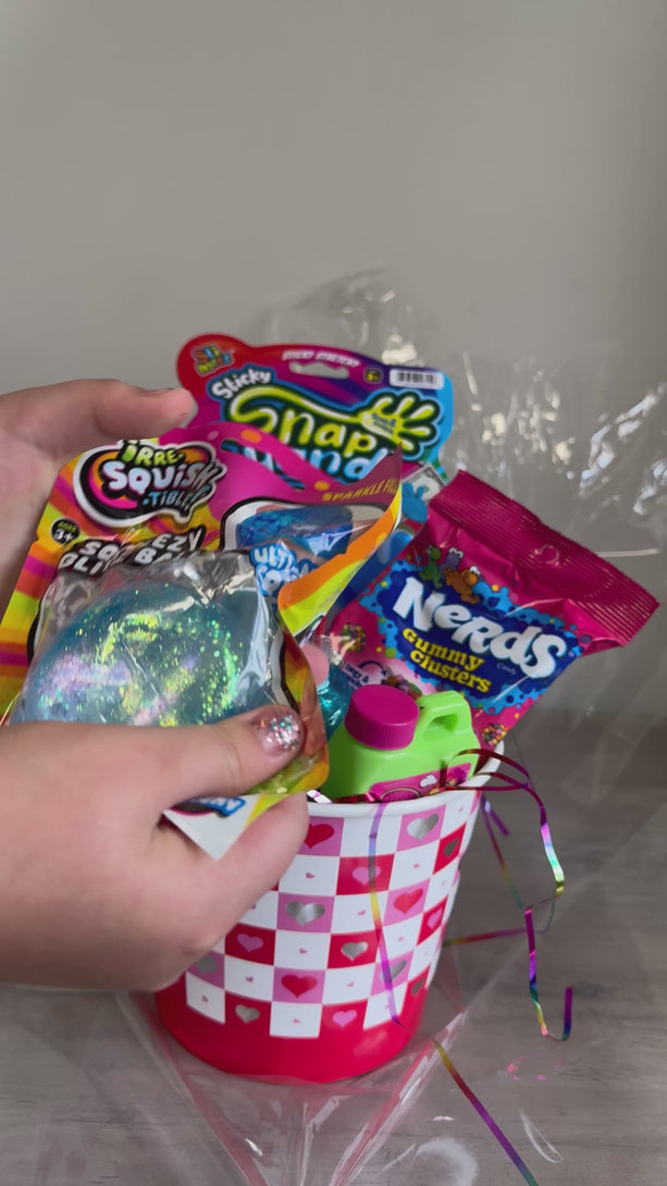 Surprise your loved one with a basket filled wiht squeezable toys and delicious candies.